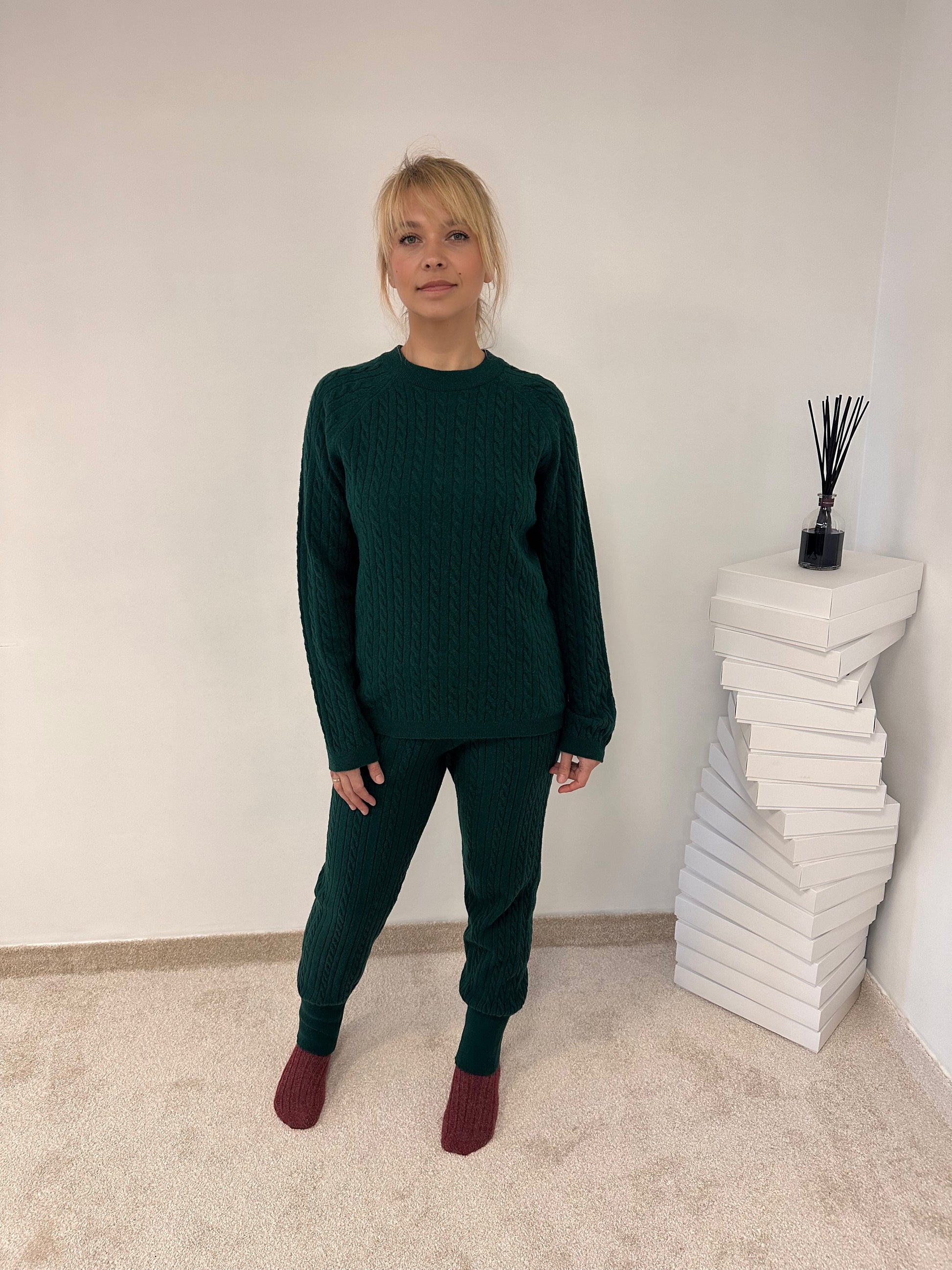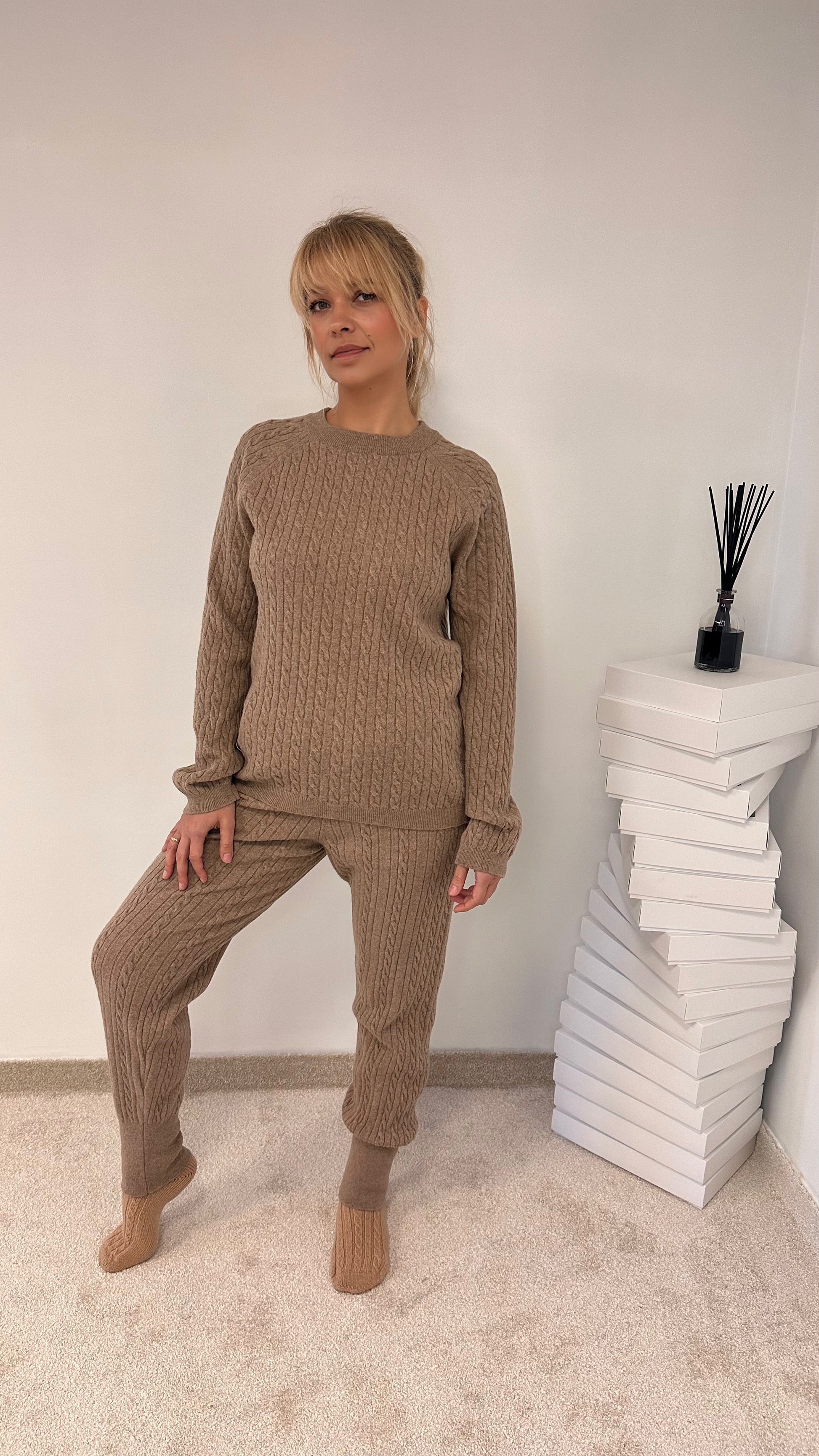 Gemütlicher Zopfmusterpullover mit Rundhalsausschnitt und langen Ärmeln, kombiniert mit der passenden Hose, ideal für sportliche Anlässe oder Freizeitausflüge.