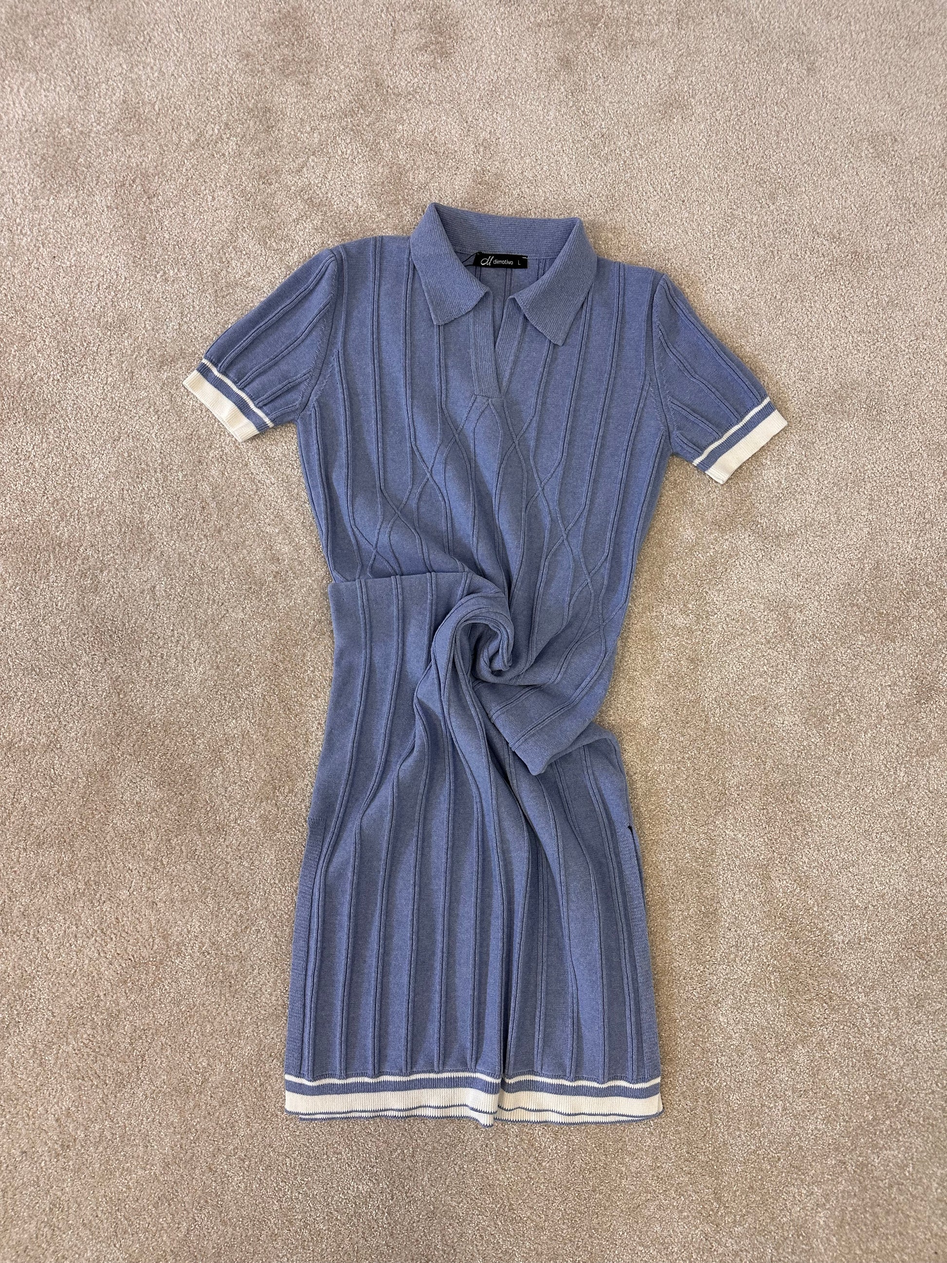 Langes Sommerkleid mit Zopfmuster, Rollkragen und kurzen Ärmeln.