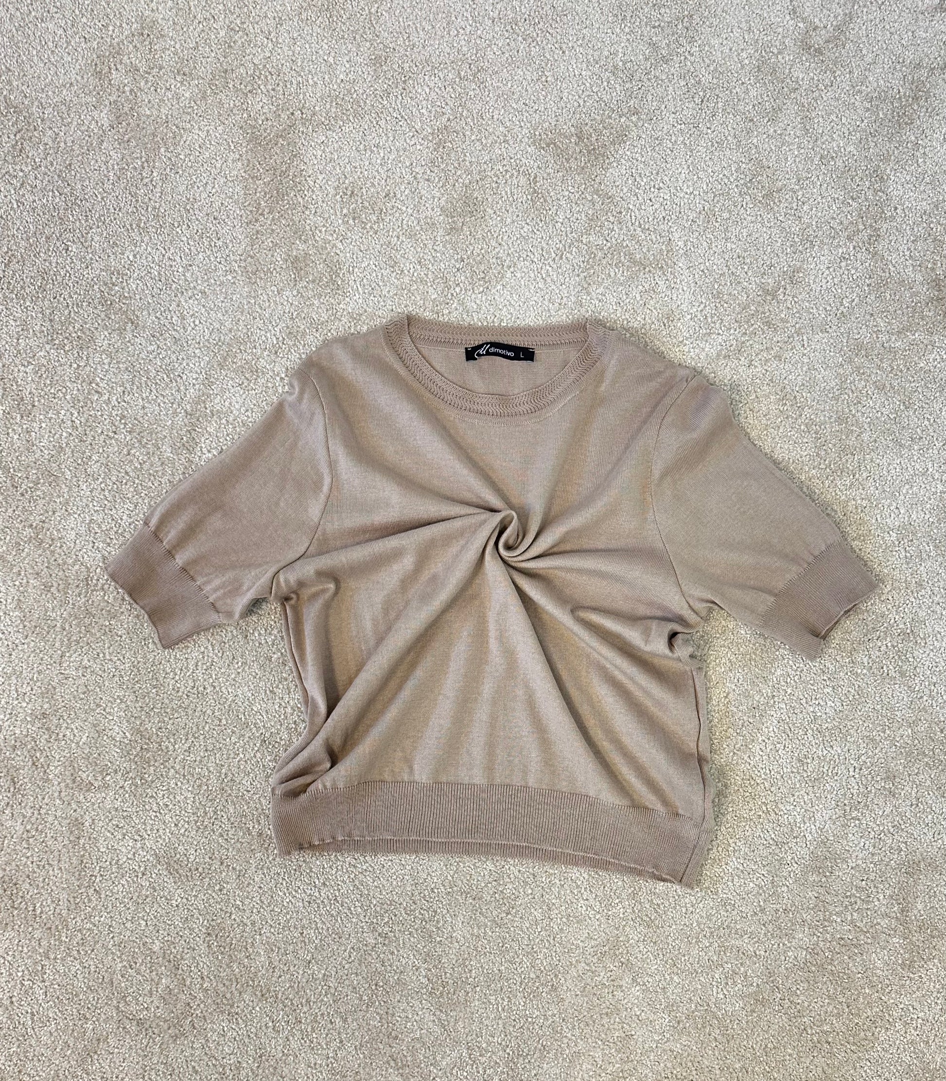 Women's knitted basic T-shirt with round neck and short sleeve.